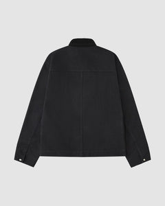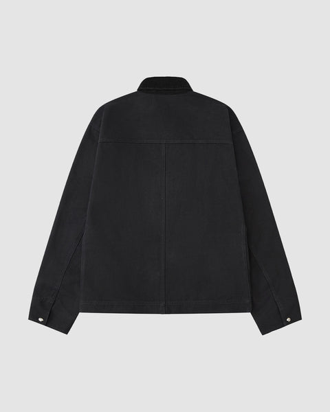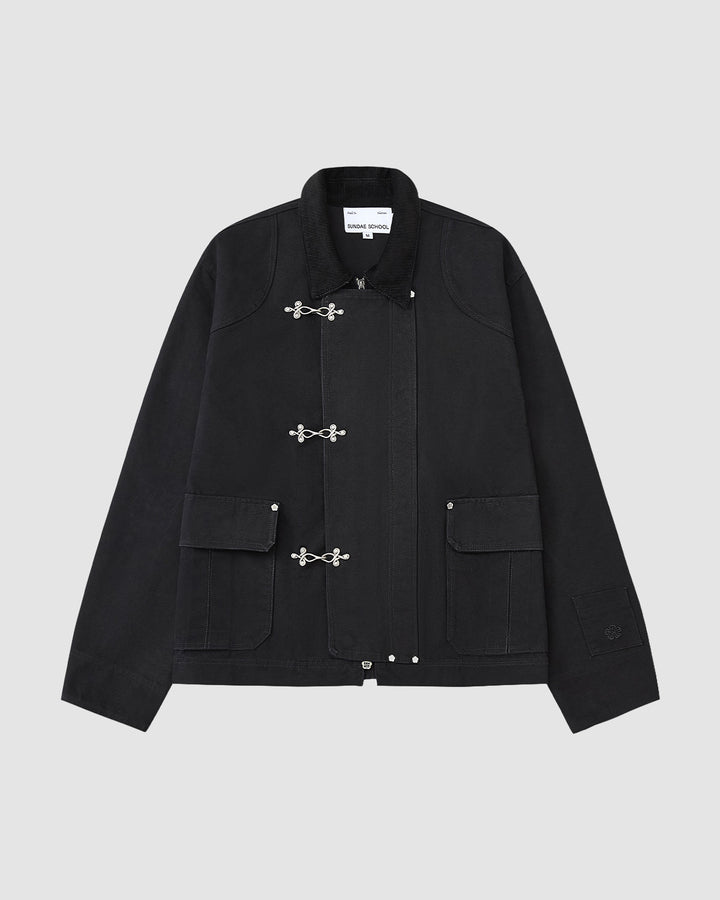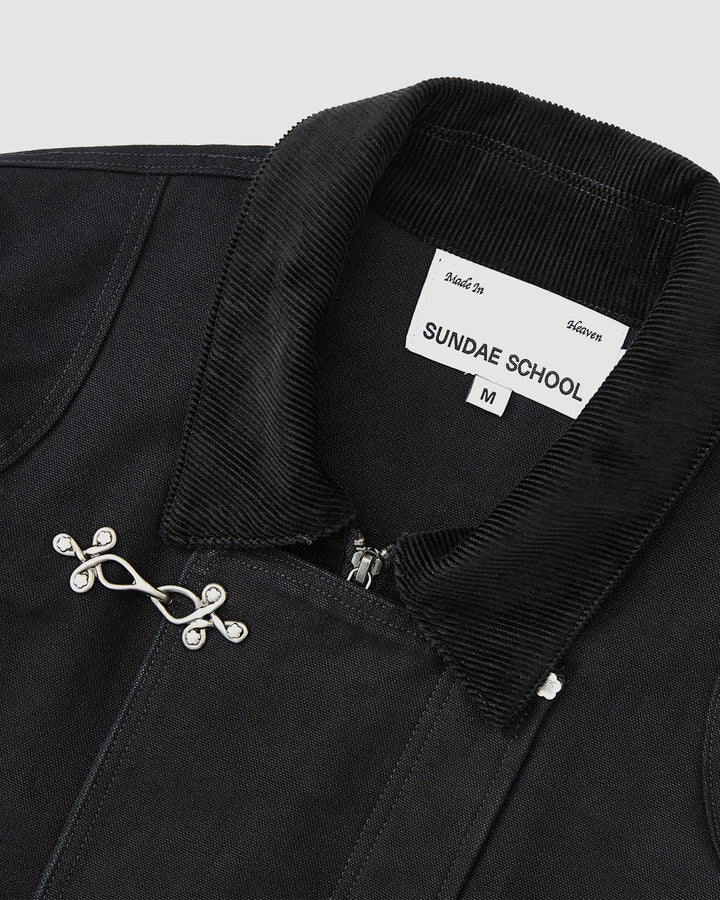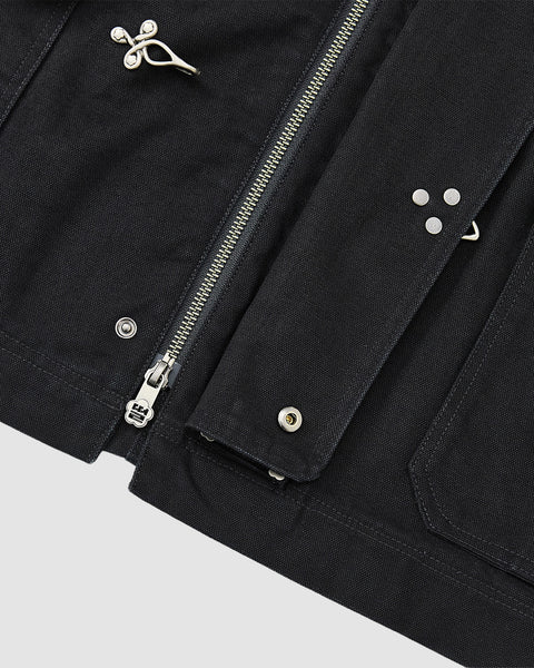 Close-up of the [PRE-ORDER] BLACK FIREMAN CLASP JACKET by Sundae School, featuring a vintage cotton look with metal clasps, visible silver zipper, snap buttons, and multiple seams and pockets for practical workwear style.