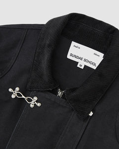 Close-up of the [PRE-ORDER] BLACK FIREMAN CLASP JACKET by Sundae School, featuring a black cotton body, corduroy collar, Mochi Floral clasp, and a label displaying Sundae School, size M, and