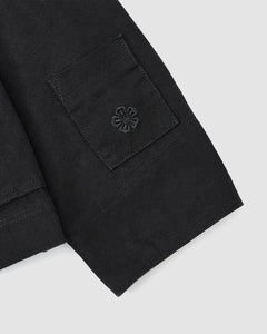 A close-up of the Sundae School [PRE-ORDER] BLACK FIREMAN CLASP JACKET sleeve shows a rectangular patch with a black embroidered flower emblem, set against a light gray background.