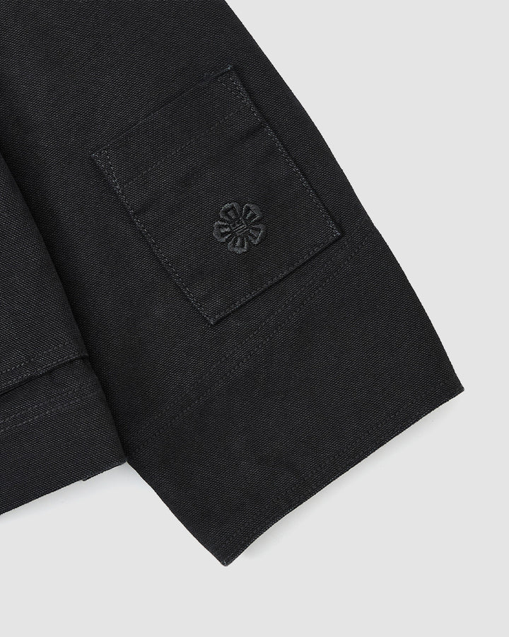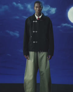 This jacket is for moments that matter—when you’re meeting the parents, honoring your ancestors, or standing face-to-face with whoever God might be.  We retranslated a clasp jacket our way: durable cotton body, storm flap front, sturdy zip closure underneath, and custom Mochi Floral clasps that do the most without doing too much. The garment-washed finish gives it that already-broken-in feel — like you thrifted it from the future.