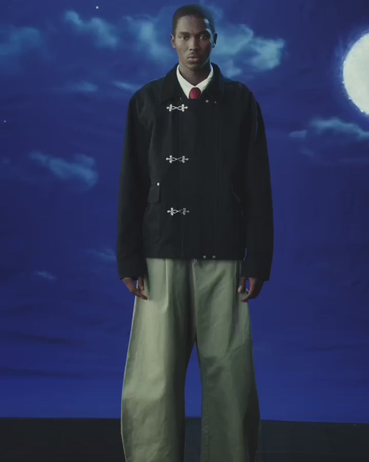 Beneath a full moon, a person faces forward with a neutral expression, wearing Sundae School’s [PRE-ORDER] BLACK FIREMAN CLASP JACKET over a white shirt and wide tan pants.