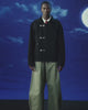 A person wearing the Sundae School [PRE-ORDER] BLACK FIREMAN CLASP JACKET with silver clasps and light pants stands with one hand in a pocket against a blurred blue background.