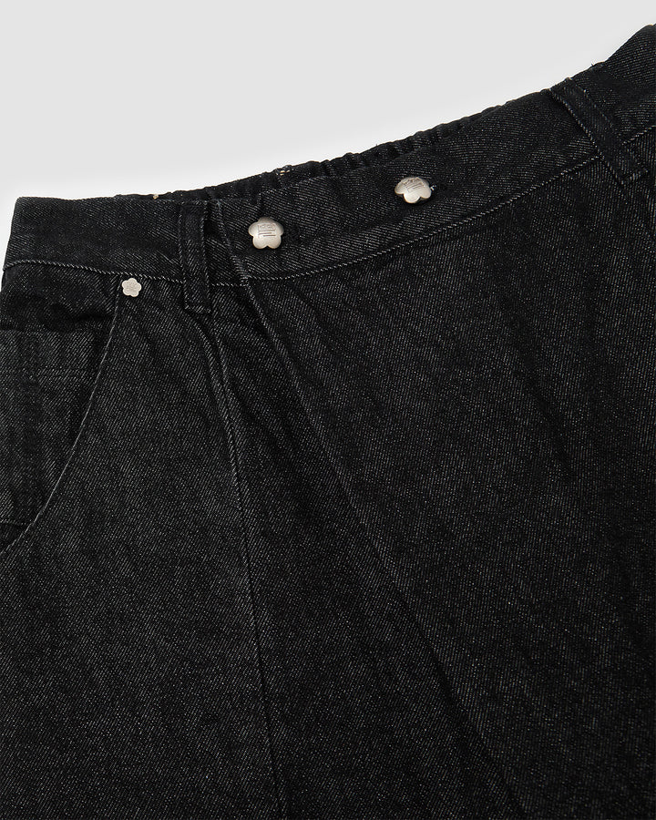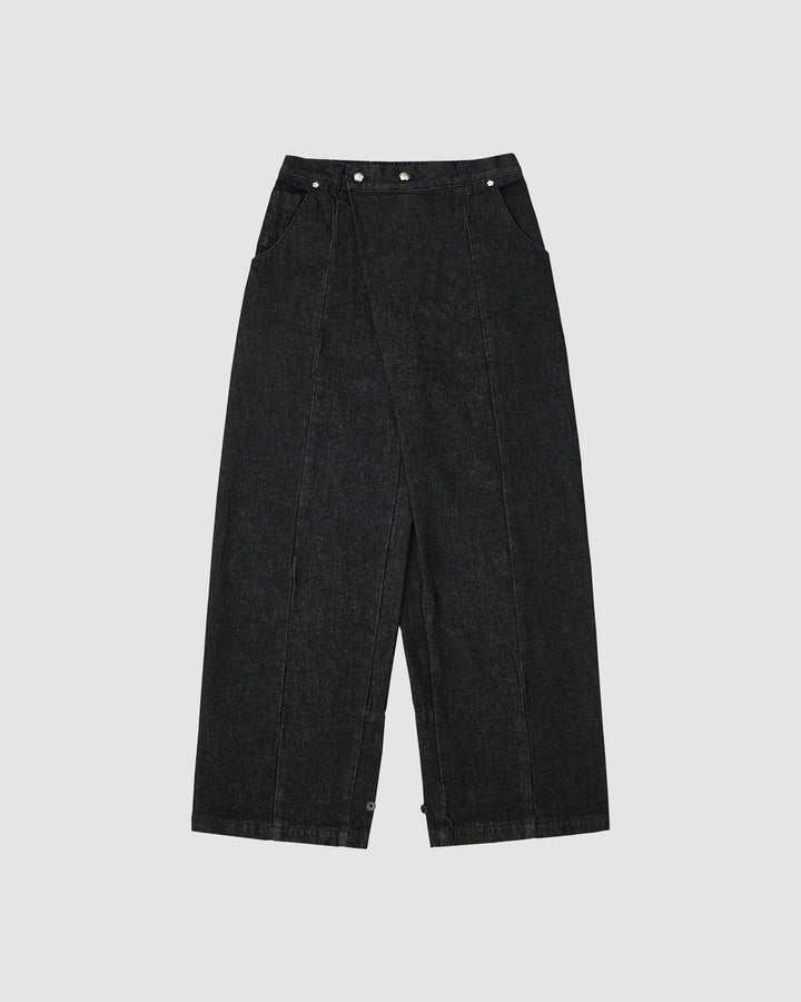 Black wide-leg hanbok denim pants with high-rise waist and asymmetric front closure featuring silver flower-shaped snap buttons, relaxed fit silhouette, flat lay photography on light gray background