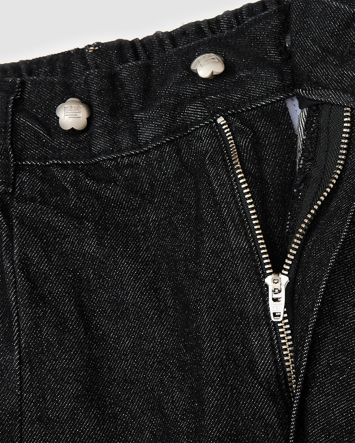 Close-up detail of black hanbok denim showing partially open zipper closure and silver flower-shaped snap button hardware, highlighting construction details and custom closure system