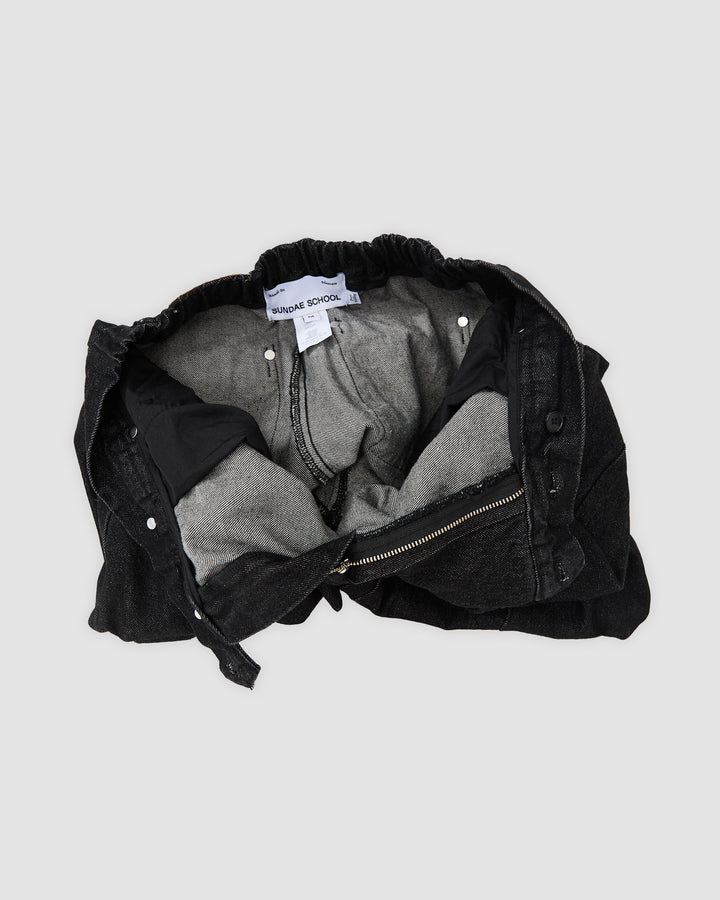 Sundae School black hanbok denim pants shown inside-out as flat lay, displaying internal construction with elastic waistband, gray cotton lining, size M label, and seam finishing details