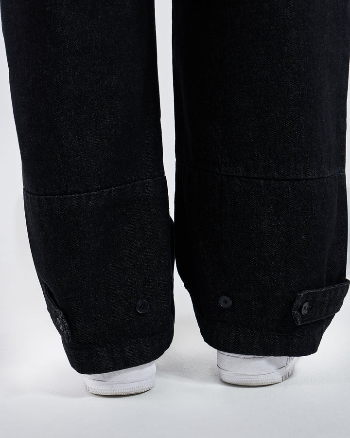 Close-up detail of black hanbok denim ankle cuff with black snap button closure, showing gathered elastic hem construction and denim texture details