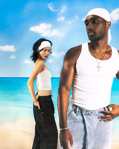 Two models in black and light blue hanbok denim pants respectively, wearing white tank tops and white headbands, posed together against tropical blue sky and turquoise ocean background showcasing both colorways