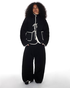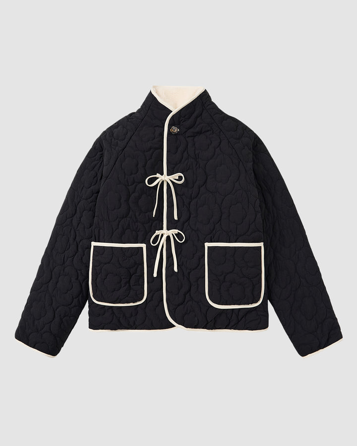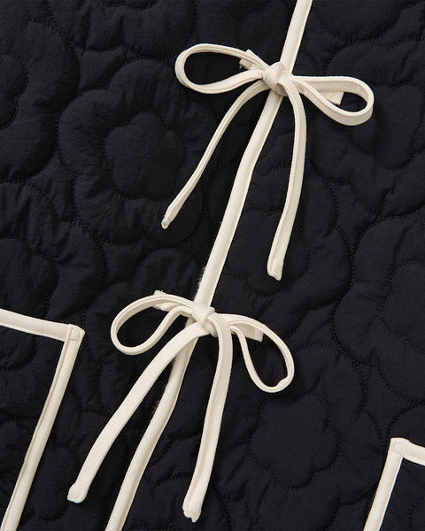 Close-up of Sundae School's BLACK IVORY REVERSIBLE FLOWER QUILTED JEOGORI FLEECE: a black Korean jacket with floral quilting, cream lining, off-white trim, single button, and front bow.