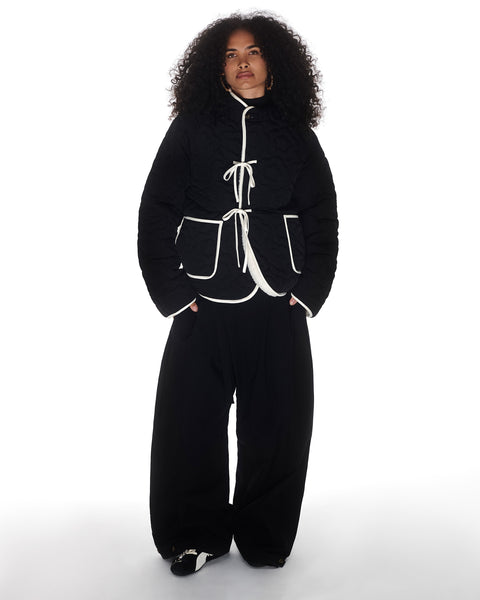 A person with curly hair wears the Sundae School BLACK IVORY REVERSIBLE FLOWER QUILTED JEOGORI FLEECE and loose black pants, standing against a plain white background.