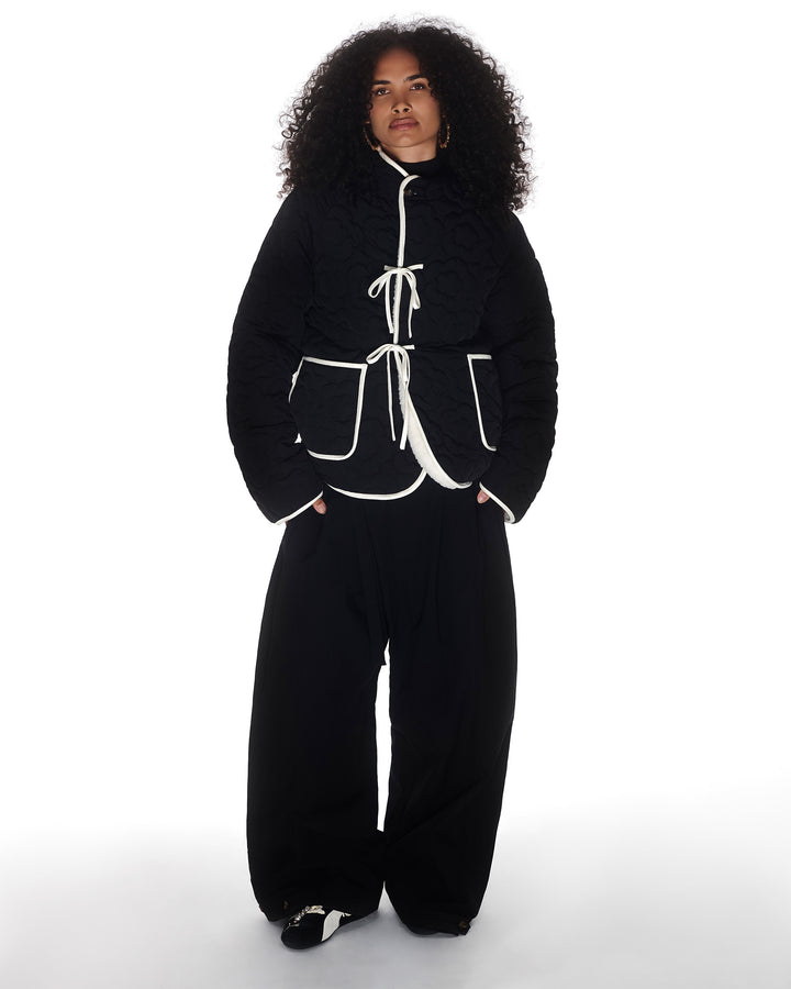 • Custom quilted flower puffer side with the asymmetric closure with suede ties + binding and "떨" logo button 🌸
