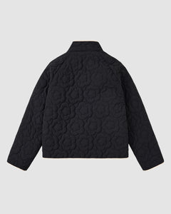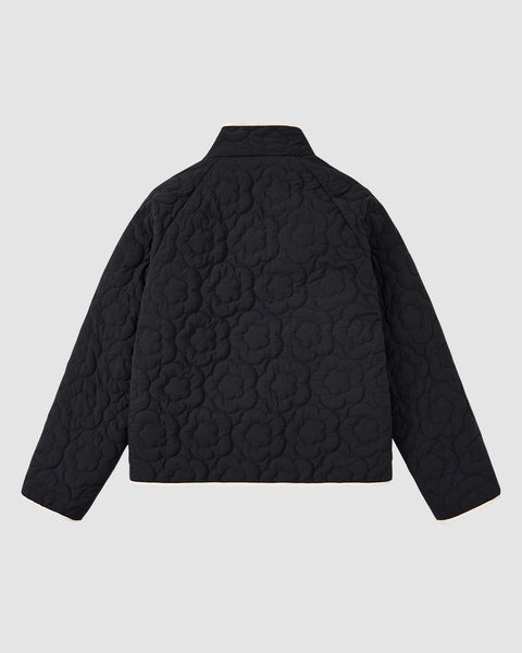 The BLACK IVORY REVERSIBLE FLOWER QUILTED JEOGORI FLEECE by Sundae School, featuring a floral embossed pattern inspired by the Korean hanbok jacket, is shown from the back against a plain light gray background.