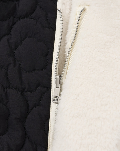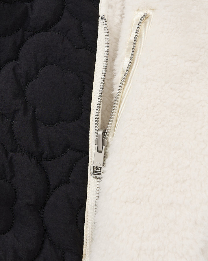 Close-up of Sundae School's BLACK IVORY REVERSIBLE FLOWER QUILTED JEOGORI FLEECE, showcasing a silver zipper, cream teddy sherpa fleece on one side, and black quilted fabric with a floral pattern on the other.
