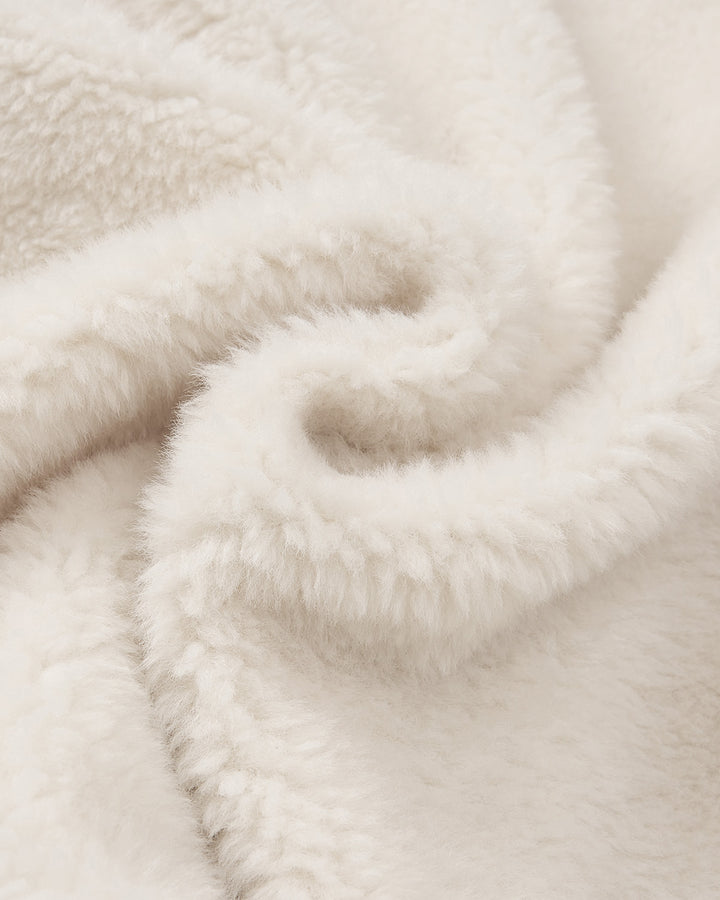 Close-up of plush, cream-colored sherpa fleece with a gentle swirl pattern from Sundae School’s BLACK IVORY REVERSIBLE FLOWER QUILTED JEOGORI FLEECE, highlighting its cozy texture and Korean-inspired jeogori jacket look.