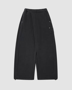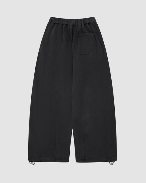 Close-up of Sundae School's FADE BLACK WRAP SWEATBAJI: wide-leg black cotton sweatpants with elasticated cuffs and an adjustable drawstring with metallic toggle, laid flat on a light gray background.