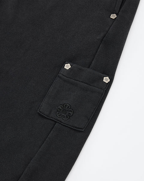 Close-up of Sundae School's FADE BLACK WRAP SWEATBAJI, a hanbok-inspired black garment with a textured finish, rectangular pocket featuring embroidered flowers, and metal floral-shaped buttons on the flap and waistband. Shown on white background.
