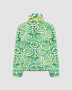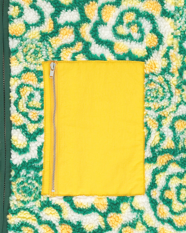 Detail shot of the Sundae School Broccoli fleece jacket featuring green and yellow floral patterned fleece's yellow chest, flat lay product shot on light background.