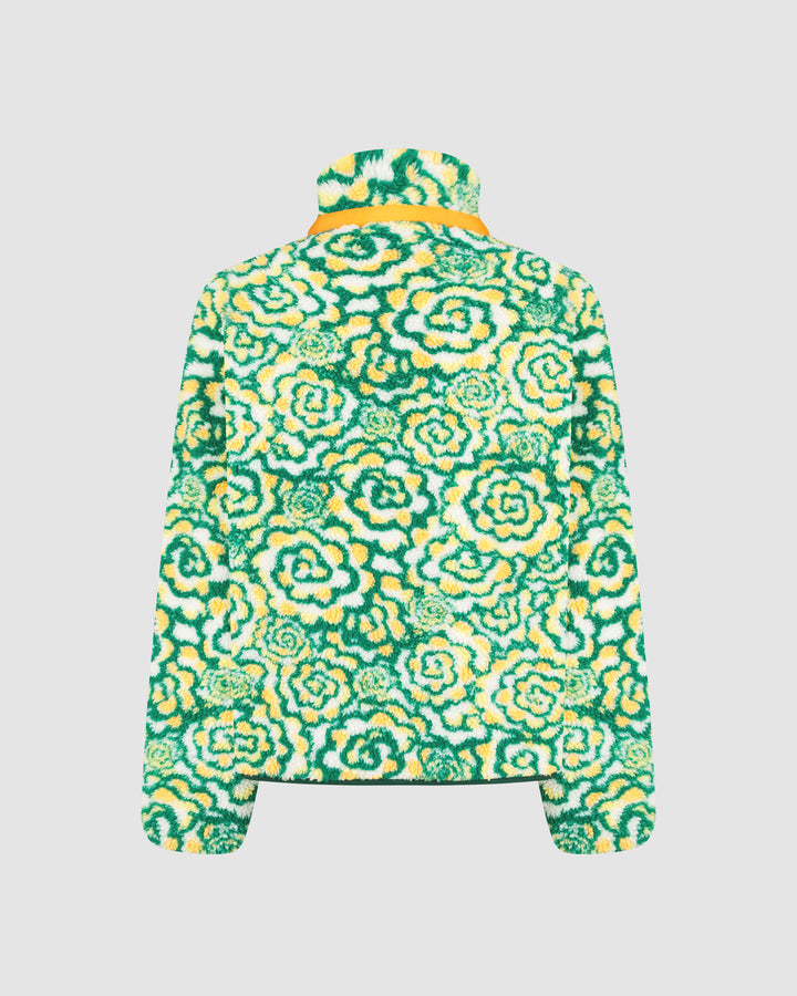 Back of the Sundae School Broccoli fleece jacket featuring green and yellow floral patterned fleece, orange contrast collar and trim details, dark green zip closure, yellow chest pocket with zipper, relaxed fit silhouette, flat lay product shot on light background.