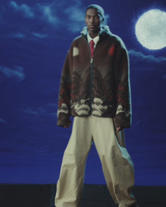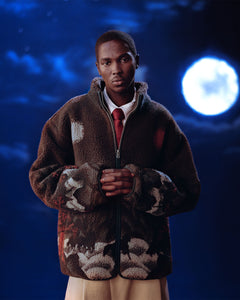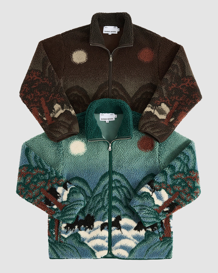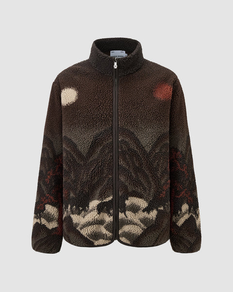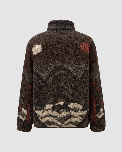 The CHARCOAL FIVE PEAKS FLEECE by Sundae School features brown embossed pile fleece with a landscape design of dark mountains, red trees, and celestial shapes on the back, inspired by Korean Sun and Moon jackets.