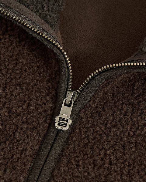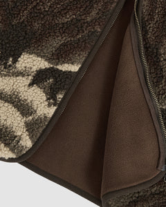Close-up of the CHARCOAL FIVE PEAKS FLEECE by Sundae School, featuring embossed brown and cream pile fleece, a smooth brown inner lining, and a partially opened zipper along the edge.