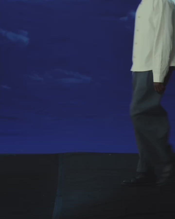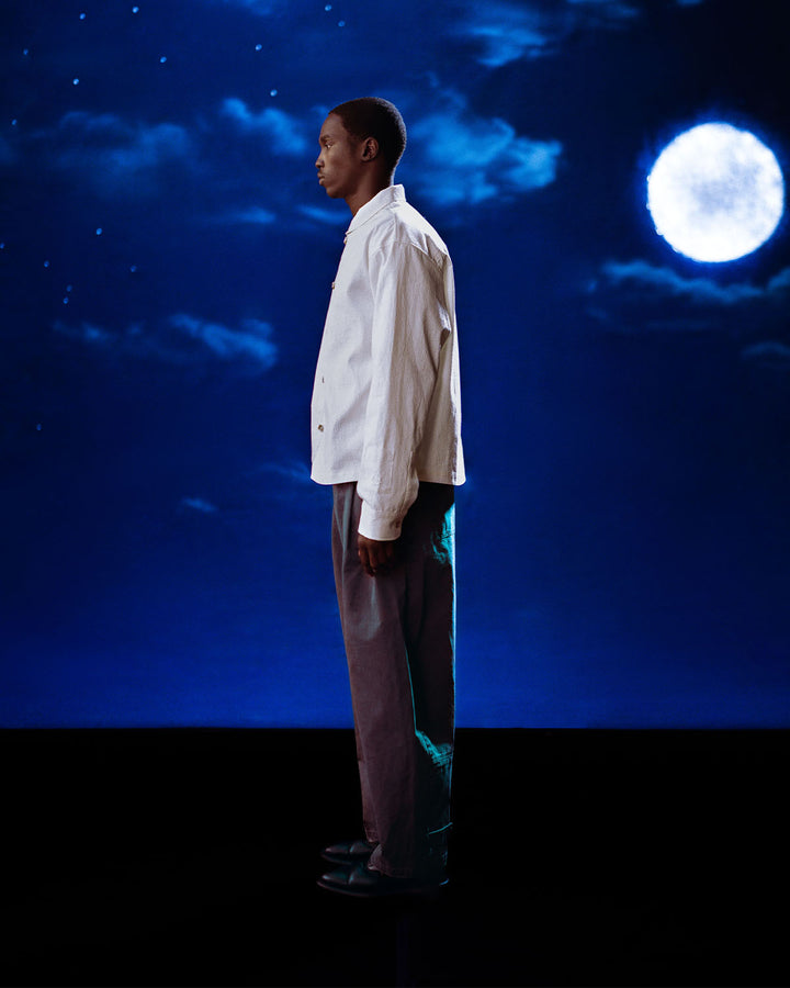 A person stands against a night sky with a full moon and clouds, wearing a white button-up shirt and Sundae School’s CHARCOAL HANBOK CHINO PANTS—hanbok-inspired pants that suit the calm, moody atmosphere perfectly.
