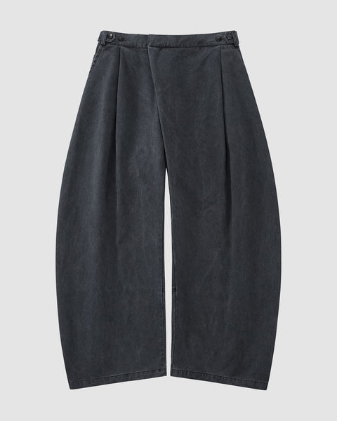 The CHARCOAL HANBOK CHINO PANTS by Sundae School feature a wide-leg, high-waist barrel-fit with front pleats, side button details, and heavy textured fabric for a modern hanbok-inspired silhouette against a plain white background.