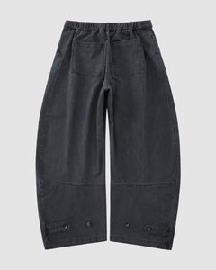 The CHARCOAL HANBOK CHINO PANTS by Sundae School feature a hanbok-inspired silhouette, loose dark gray fabric, elastic waistband, large back pockets, and adjustable buttoned cuffs, displayed flat on a light gray background.