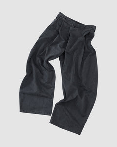 Sundae School’s CHARCOAL HANBOK CHINO PANTS feature a hanbok-inspired, loose wide-leg silhouette with waist pleats, side pockets, and button details, shown laid flat on a light gray background.