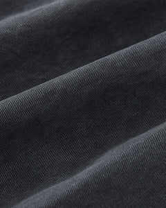 Close-up of dark grey fabric with a diagonal weave, showcasing the textured, three-dimensional look of Sundae School’s CHARCOAL HANBOK CHINO PANTS and their hanbok-inspired silhouette.