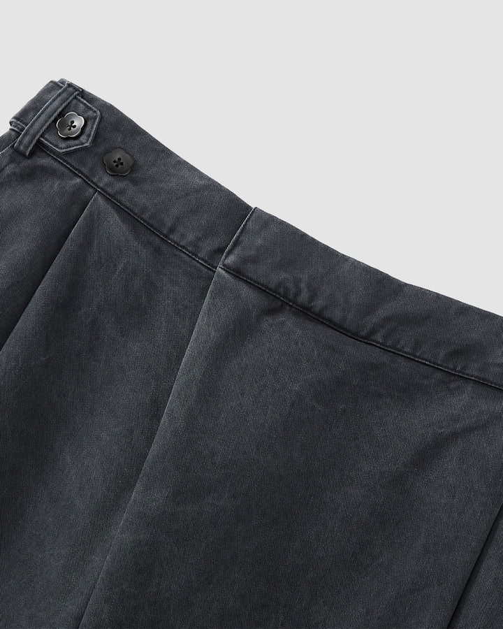 Close-up of the waistband and upper section of Sundae School CHARCOAL HANBOK CHINO PANTS with pleats, belt loops, and two black buttons, highlighting their hanbok-inspired silhouette against a light gray background.