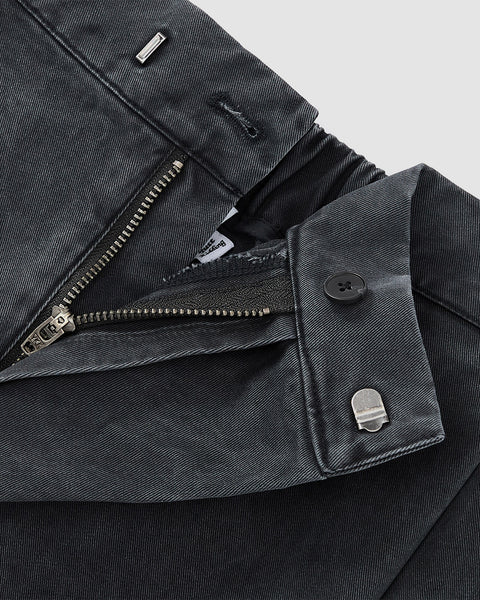 Close-up of the waistband and fly on Sundae School CHARCOAL HANBOK CHINO PANTS, showing a zipper, button, metal clasp, and belt loop detail—set against a plain light background.
