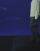 A person stands in profile against a night sky, wearing a white shirt, dark shoes, and Sundae School's CHARCOAL HANBOK CHINO PANTS with a hanbok-inspired silhouette.