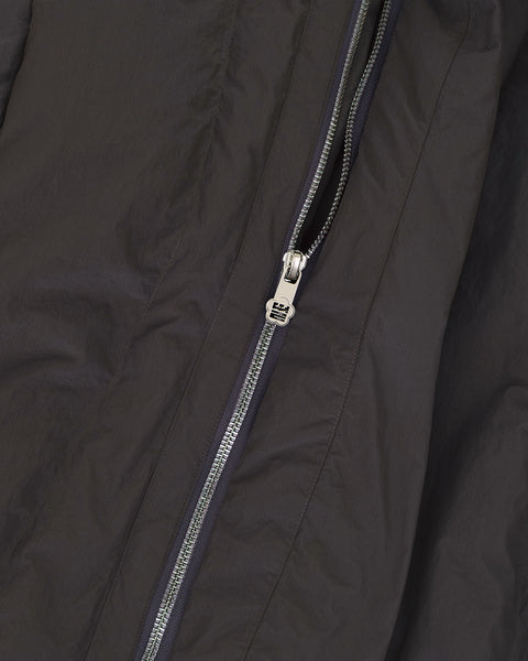 Close-up of the Sundae School CHARCOAL HEAVYWEIGHT MOCHI PUFFER, showcasing its rich fabric texture and detailed silver zipper partially unzipped.