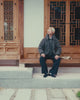 A person wearing Sundae School’s CHARCOAL HEAVYWEIGHT MOCHI PUFFER, featuring hanbok-inspired design with a neck bow and pockets, stands against a plain white background. They are also wearing sunglasses.