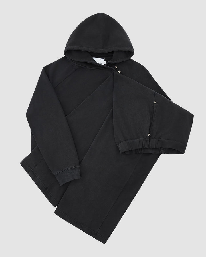 The Sundae School FADE BLACK HANBOK HOODIE features an asymmetric hood closure and a custom