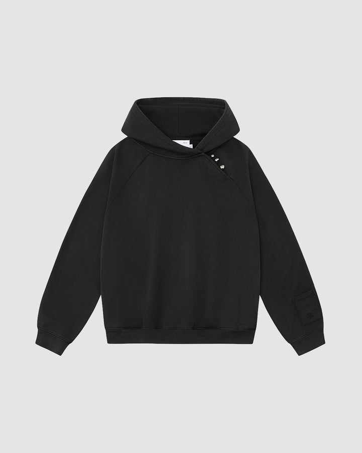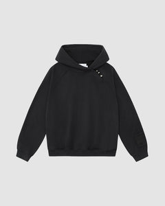 The FADE BLACK HANBOK HOODIE by Sundae School features raglan sleeves, an asymmetric hood closure, three metallic snaps on the left shoulder, and a patch detail on the left sleeve, shown against a light gray background.