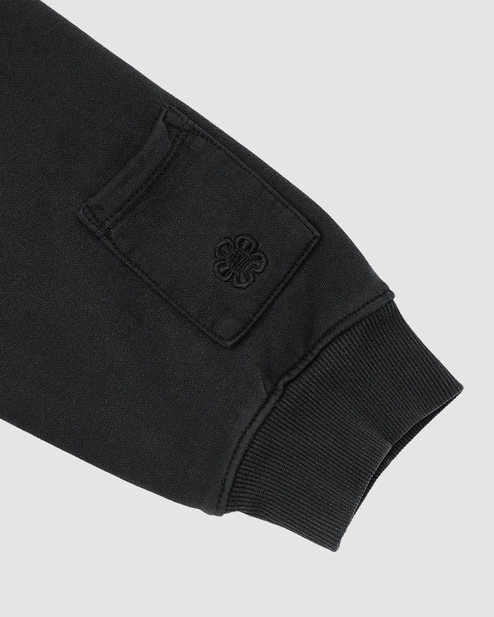 The FADE BLACK HANBOK HOODIE by Sundae School features black long sleeves with ribbed cuffs and a small rectangular stash pocket above the wrist, embroidered with a flower-like design, set against a light gray background.