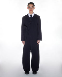 Against a white background, a person wears Sundae School's NAVY HANBOK BALLOON PANTS, paired with an oversized black suit, asymmetrical buttoned jacket, white shirt, and black tie. One arm is tucked in the jacket, and their expression is neutral.