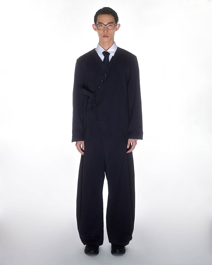 A person faces forward in a Sundae School NAVY HANBOK TIE BLAZER with an asymmetric side tie and wide-legged pants, paired with a white shirt and tie, set against a plain white background.