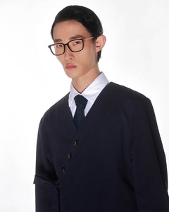 A person with short dark hair, glasses, a white collared shirt, dark tie, and the Sundae School NAVY HANBOK TIE BLAZER with an asymmetric button design stands against a plain white background.
