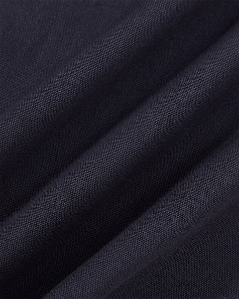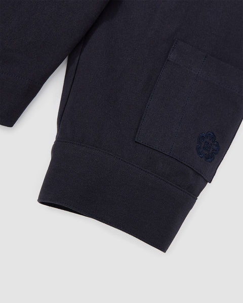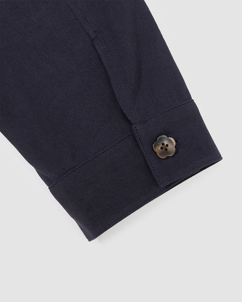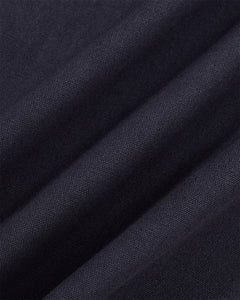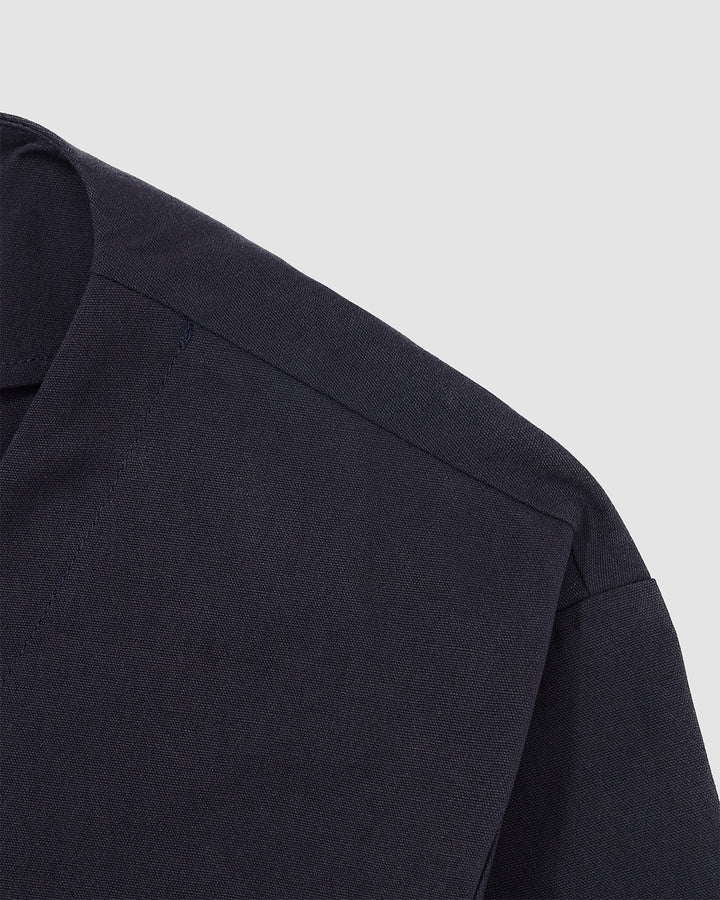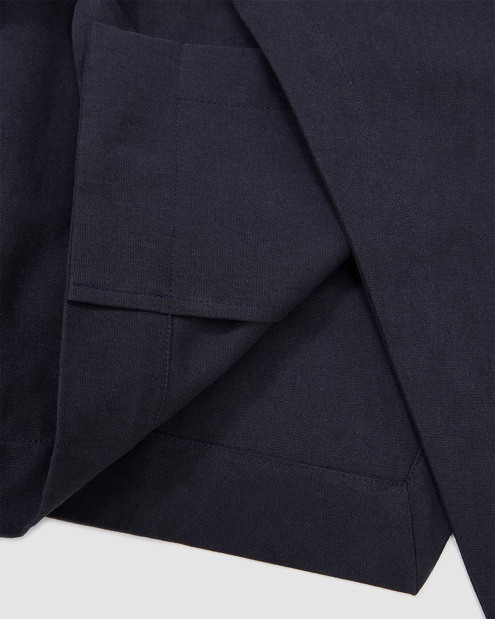 Close-up detail of the navy blue linen fabric texture of the Hanbok Tie Blazer.
