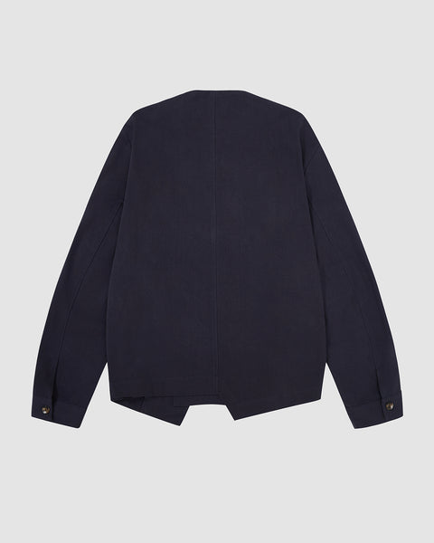 Back view of the navy blue Hanbok Tie Blazer showing the clean, minimalist design and relaxed fit.