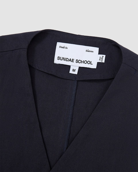 Close-up of the collar area of the Hanbok Tie Blazer showing the Sundae School brand label and V-neckline construction.