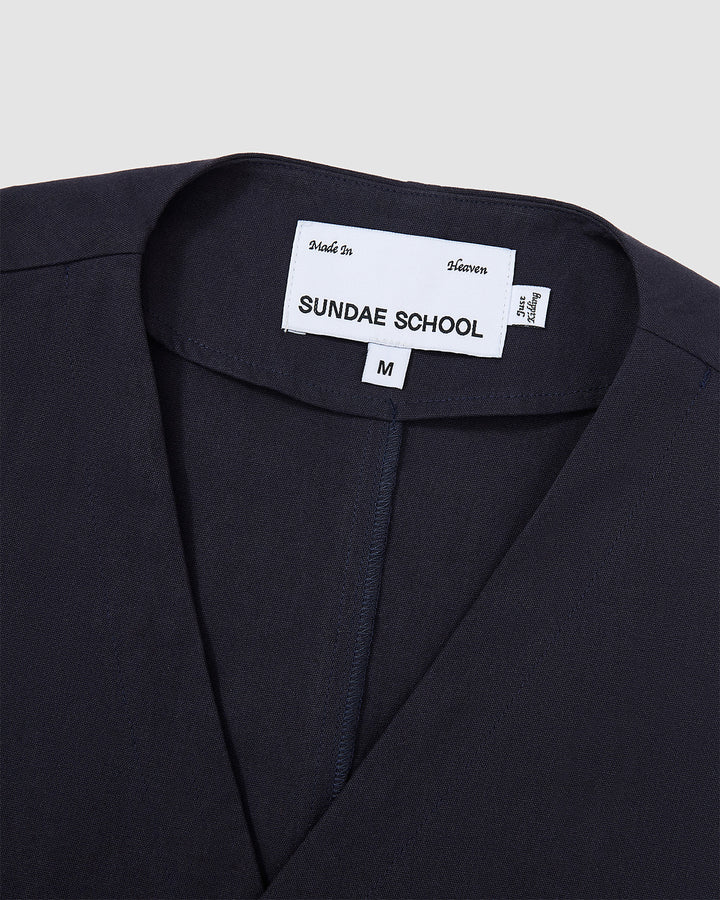 A person with dark hair wears the Sundae School NAVY HANBOK TIE BLAZER over a white collared shirt and black shoes, standing against a white background, leaning slightly forward with hands behind their back.