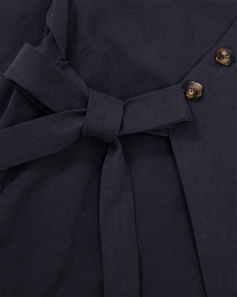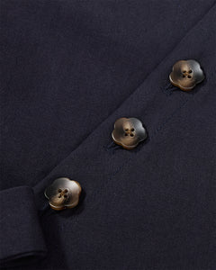 Navy blue Hanbok Tie Blazer with V-neckline, three flower-shaped buttons, asymmetrical tie closure at the waist, and long sleeves.