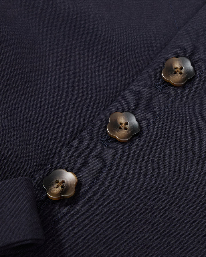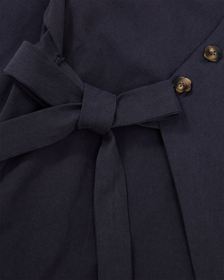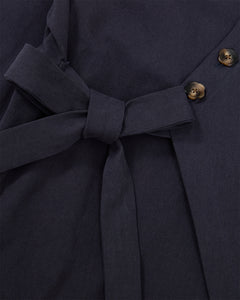 Detail of the navy fabric tie belt and flower-shaped buttons on the Hanbok Tie Blazer.