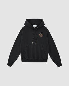 The HIGH HORSE LNY HOODIE by Sundae School features a black design with a front pocket, drawstrings, a small multicolored emblem on the left chest, and a patch on the left sleeve, shown on a light gray background.
