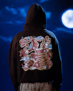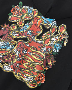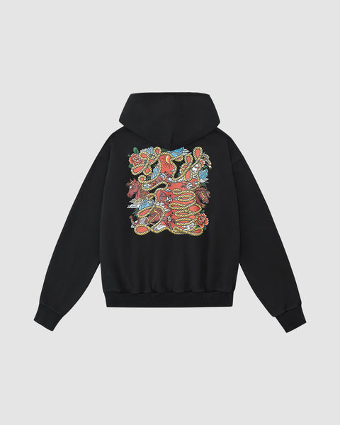 The Sundae School HIGH HORSE LNY HOODIE is a black hoodie with a vibrant, detailed graphic of intertwined snakes and flowers on the back, blending reds, yellows, greens, and blues against the dark fabric.