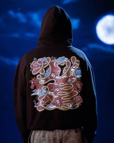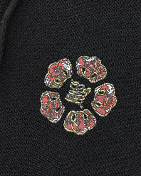 The HIGH HORSE LNY HOODIE by Sundae School features five red bull heads in a circular rope border around a central coiled rope, all printed on a black fabric background.