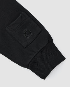 A close-up of the sleeve on the Sundae School HIGH HORSE LNY HOODIE shows a ribbed cuff, a small pocket, and an embroidered flower-like emblem on the pocket.