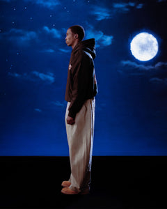 Someone wears the HIGH HORSE LNY HOODIE by Sundae School with light pants, standing with one hand in their pocket against a night sky featuring a full moon and clouds.